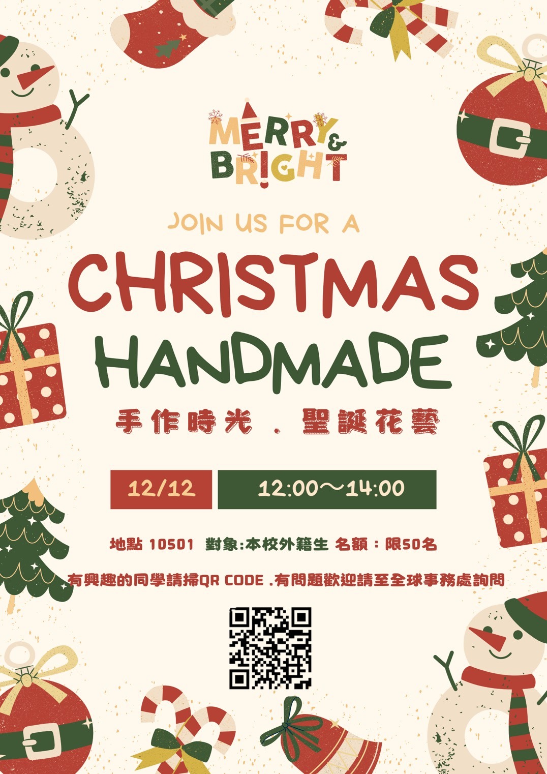 全球處誠摯邀請本校外籍生一起享受療癒的手作時光,打造專屬於你的冬日小作品,為宿舍或房間添上滿滿聖誕氛圍。